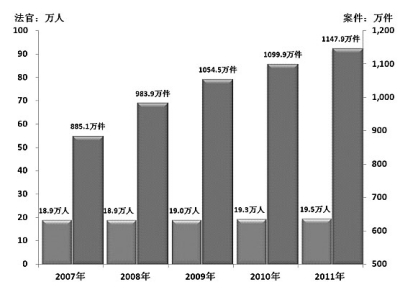 根据最高人民法院的统计,全国法院审执结案件总量,从2007年的885.1万件,已增加到2011年的1147.9万件,处于稳步上升状态。与之相比,全国法官总数只从18.9万人增加到19.5万人,与1979年相比,仅增加了2.31倍,增幅并不明显。由于案件增长迅速,法官数量增幅不大,一些法院“案多人少”的矛盾日益突出。例如,江苏省各级法院2012年受理案件已经突破百万,较2007年增长43.21%。全省一线法官人均结案141.30件,个别基层法院一线法官人均结案数达455.17件。据了解,某些地区基层人民法庭法官结案数甚至达到700至800余件,远超人均办案数的极限值(见附表)。