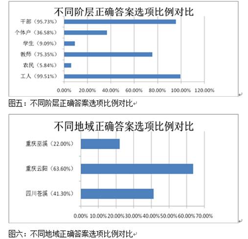 不同地域和阶层公民掌握情况的差异(以18题为例)如图五和图六所示: