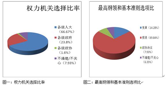 接着便是关涉到一切公民、团体和组织的活动之最高纲领和基本准则的调查。在被收回400份问卷中,有69.84%选择了“中华人民共和国宪法”;14.28%的选择了党的纲领;有7.93%和6.35%的人选择了“政治协商会议决议”和“不清楚/不关心”。其分布如图二所示(见上图)。