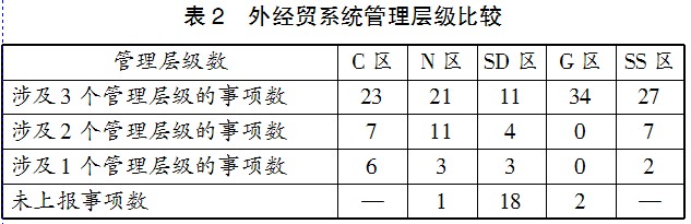 在管理层级方面,除两个涉密事项外,一市五区的外经贸事项均没有超过3个管理层级。其中,市局有26个事项需经3个管理层级,占上报事项总数的67%;有11个事项需经2个管理层级,占上报事项总数的28%。五区有关管理层级的情况如表2所示。