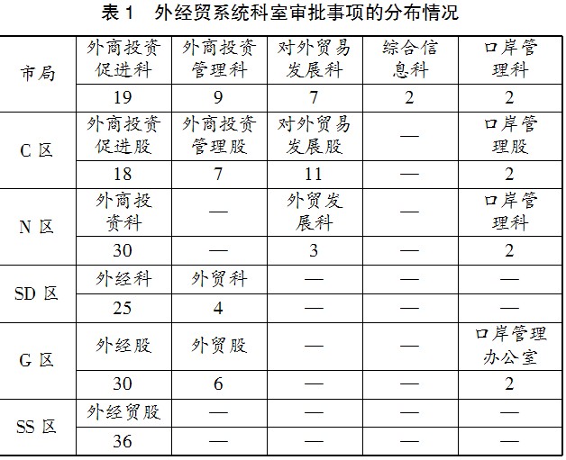 调研表明,N区外经贸系统承担审批事项有35个,SD区外经贸系统承担审批事项30个,C区、G区、SS区分别为38、38和37。具体分布情况是:SD区的外经贸事项比较集中,主要分布在外经科和外贸科两个科室;N区经贸局涉及外经贸的审批事项的业务总量仅次于G区,其审批事项主要是由外商投资科、口岸管理科以及外贸发展科承担;SS区审批事项则全部集中到了1个科室,C区有4个科室承担涉及外经贸事项的审批,G区的审批事项则集中分布于2个科室,在一市五区的外经贸系统中审批事项集中率仅次于SS区(见表1)。