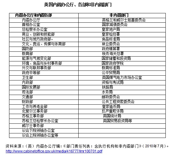 英国政府部门可以分为内阁各部与非内阁部门。内阁各部由部长领导,部长属于内阁成员。截止到2012年8月,英国内阁各部除内阁办公厅外,设商业、创新和技能部等20多个部。非内阁部门由非内阁成员的资深人士领导,如国家减债委员会等。