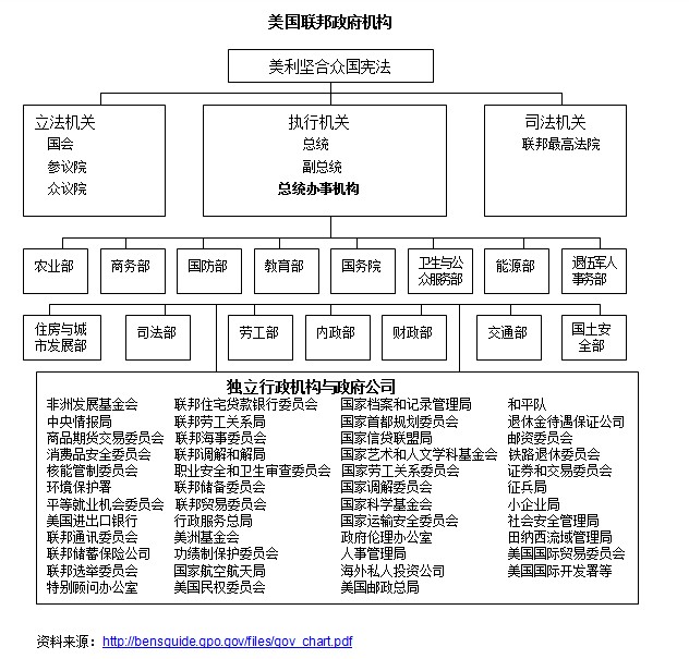 美国联邦行政机构,主要有总统办事机构、内阁各部、独立行政机构和政府公司。