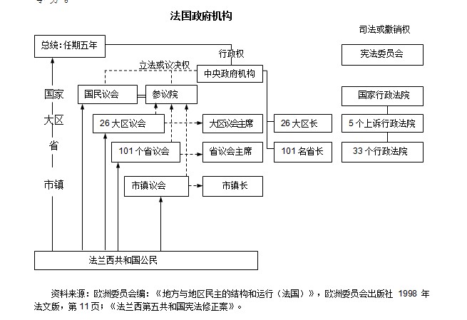 在法国的大区、省,中央政府设置大区长、省长及其附属机构。中央政府各部门在大区、省也设派驻机构,一方面在业务上接受所属部的领导和指挥;另一方面,接受所在地区的大区长或省长的统一领导,协助其开展工作,并各司其职。