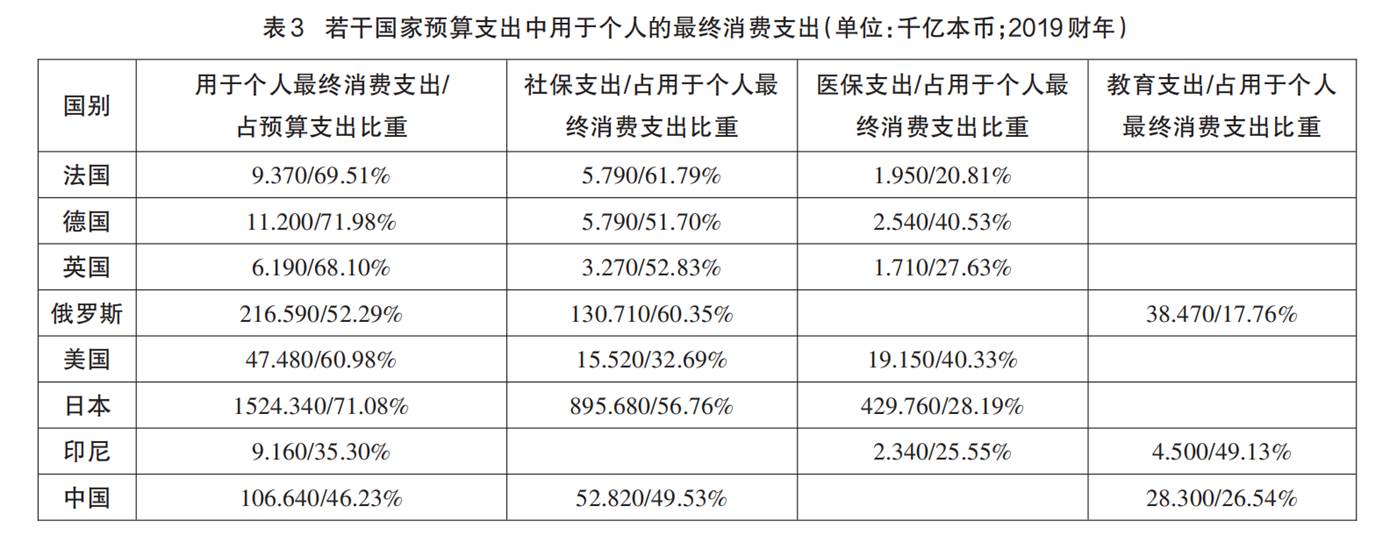 笔者根据IMF相关数据计算了若干有样本意义国家的广义政府2019财年预算支出中,用于个人的最终消费支出所占比重及在四个项目中居第一、第二的项目所占的比重(见表3)。(30)