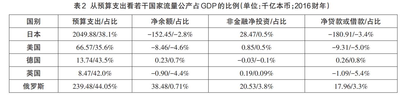 为获得直观印象,我们不妨在全球范围选定几个比较有样本意义的国家,以2016财政年度为例(俄罗斯只有2012年的数据),从各国广义政府部门资产负债表看看它们总的预算支出的数据及其占本国同年度GDP的比重(见表2(13))。