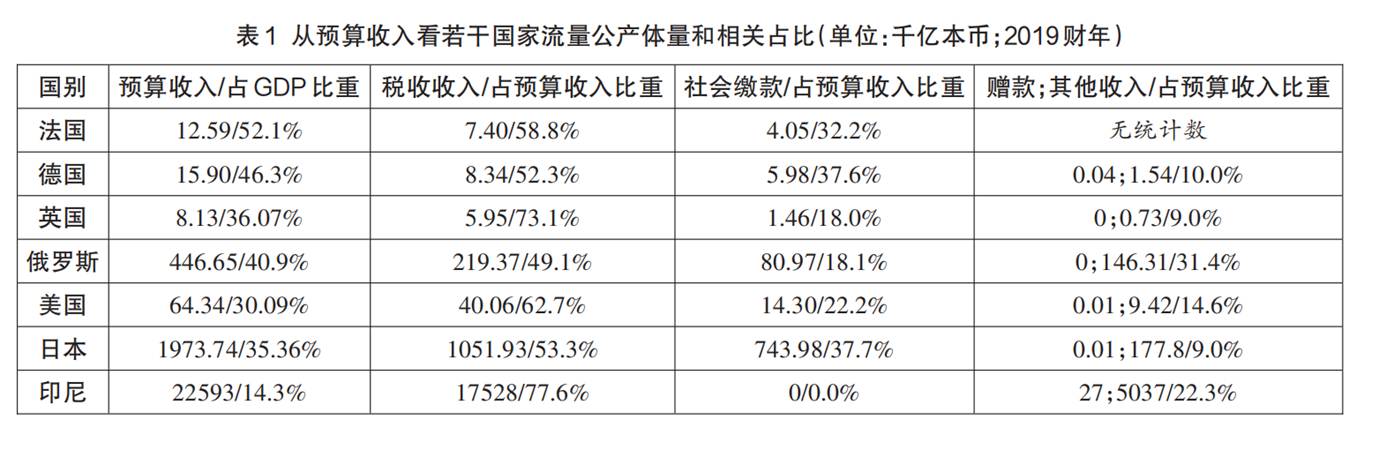 比公共部门资产净值更重要的是处于流量状态的公产,即按财政年度确定的进入政府预算收入或支出过程的公产,它生成现实的权力。国际货币基金组织一般把各国的预算收入来源分为四类:(1)税收,如所得税、资本利得税、房产税、商品和服务税等;(2)社会缴款,如社保缴款,包括各类雇主雇员缴款、个人缴款的其他社会缴款;(3)赠款,指政府从其他居民、非居民政府单位、国际组织收到的无须付任何对价的资产;(4)其他收入,如广义政府通过国有资本、技术和管理等要素参与社会生产和生活活动所产生的财产收入,以及租金、利息收入等。表1是若干有样本意义国家2019财政年度以该国货币计算的GDP、广义政府预算收入及其构成比例。(12)