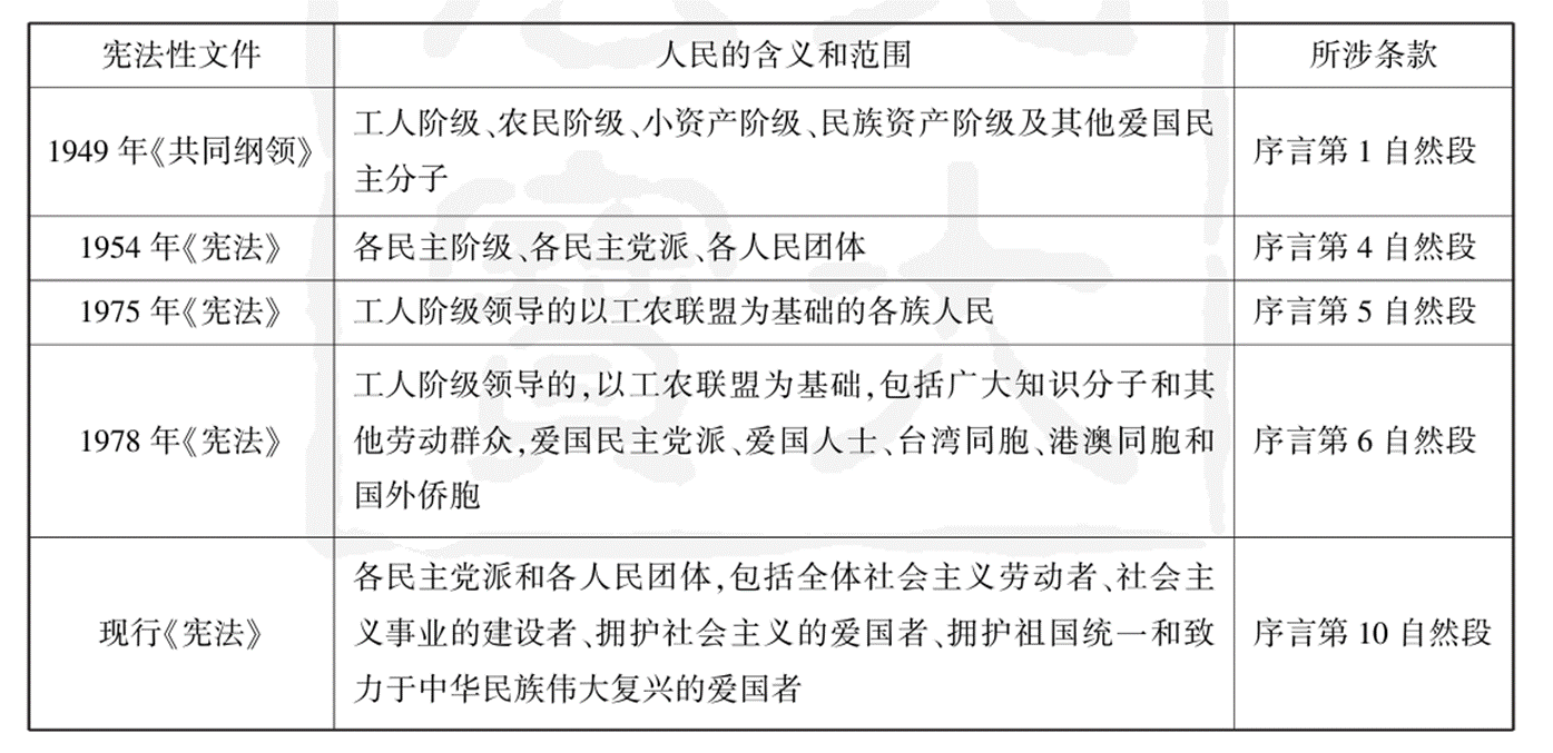 从我国历部宪法性文件序言中“人民”的范围变动及其表述上的变化来看,20世纪30年代以来中国共产党人就一直通过明确“统一战线构成”的方式,区分人民和敌人,尽管在新中国成立之后的多个宪法性文本中并没有对人民的概念加以定义,而在另外一些重要场合,制宪者对“人民”一词的说明,则不断加深了“人民等于统一战线构成”的观念。[28]据此,杨陈在对宪法文本中“人民”的七种用法[29]作了非常细致的文本分析后指出:“就每一种用法自身而言,都有其正当的理由存在。但如果把这七种用法叠加在一起就难以形成一个内在融通的意义体系,甚至在有些用法之间,如果不加以适当的解释则是相互矛盾的。而这对于宪法学体系和宪法秩序都是难以接受的。”[30]而且,到目前为止,现有研究并没有能对“人民”这一概念作出一个内在融贯的定义,也没有能充分回应因“人民”一词本身的歧义产生的诸多争论。