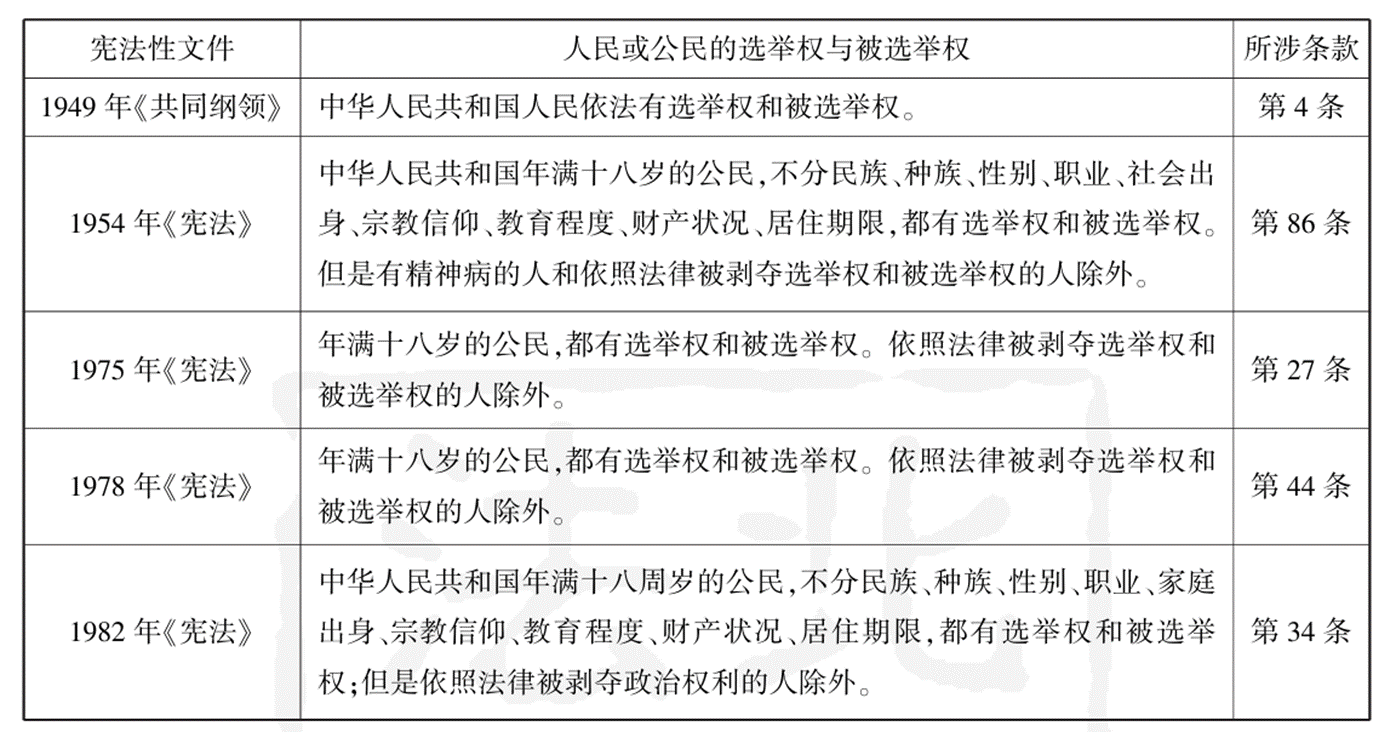 从下述宪法性文件的比较规定来看,1949年《共同纲领》规定了人民而非公民的选举权与被选举权,另外4部《宪法》皆规定了公民的选举权与被选举权。从公民的选举权与被选举权的限制来看,4部宪法除了规定“年满十八周岁”的限制条件,1954年《宪法》规定的限制条件是“有精神病的人和依照法律被剥夺选举权和被选举权的人除外”,1975年《宪法》、1978年《宪法》规定的限制条件是“依照法律被剥夺选举权和被选举权的人除外”,1982年《宪法》规定的限制条件是“依照法律被剥夺政治权利的人除外”。可见,5部宪法性文件规定的人民或公民的选举权与被选举权的限制性条件并不相同。比较而言,现行1982年《宪法》的规定更加明确具体,更加有利于保护公民的民主政治权利。[32]