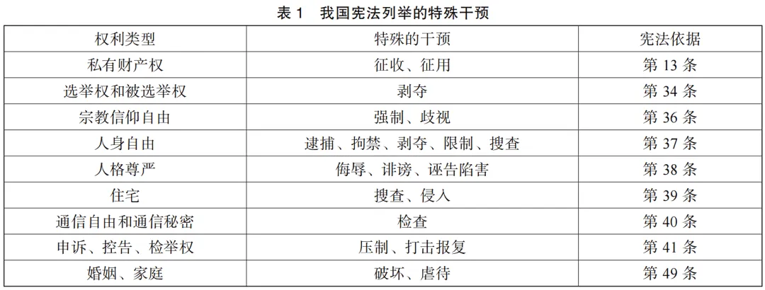 所谓特殊干预是指我国宪法中特别列举了一些特定的干预方式(如表1所示),这可能是考虑到这些干预方式比较典型或者对于公民权利的干预比较严重,故专门予以提示。对此,许崇德教授指出,宪法在肯定对某项人身权利的保护的同时,又从另个角度增设了禁止性规定。例如,在规定公民不受非法逮捕的同时,接着写了两个“禁止”,即“禁止非法拘禁和以其他方法非法剥夺或者限制公民的人身自由,禁止非法搜查公民的身体”。又如,在规定公民的住宅不受侵犯的同时,又规定“禁止非法搜查或者非法侵入公民的住宅”等。这样的双重规定,使得人权的保护非常严格。[75]肖蔚云教授也指出,这部分的内容大多是新加的(指第37—41条的内容——笔者注),它是总结了“文化大革命”的严重教训而写出来的。[76]
