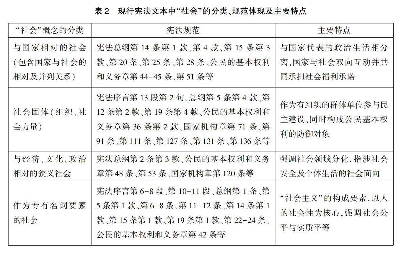 社会是我国宪法中的基础秩序单元。在现行宪法文本中,“社会”一词共出现87次。除“社会主义”表述外,“社会”一词在宪法文本中共出现37次,涉及社会治安、社会保障、社会经济秩序、社会力量、社会团体等语词搭配。从词义来看,最广义的社会包含了国家,国家是从社会中发展出的一种功能性组织。广义的社会排除了政治生活的内容,包括社会安全、经济和文化生活,而狭义的社会仅指社会安全及与个人生活保障有关的事务。[49]根据“社会”在宪法文本中的分布与不同内涵,可将现行宪法文本中的“社会”概念分为四种类型:一是与国家相对的社会,二是与经济、文化、政治等对应的狭义社会,三是作为社会力量或社会团体意义的社会,四是作为专有名词组成要素的社会。在分析社会概念的含义和功能时,应结合宪法文本的具体内容与体系化的方法进行综合判断,以避免把社会概念的解释绝对化。