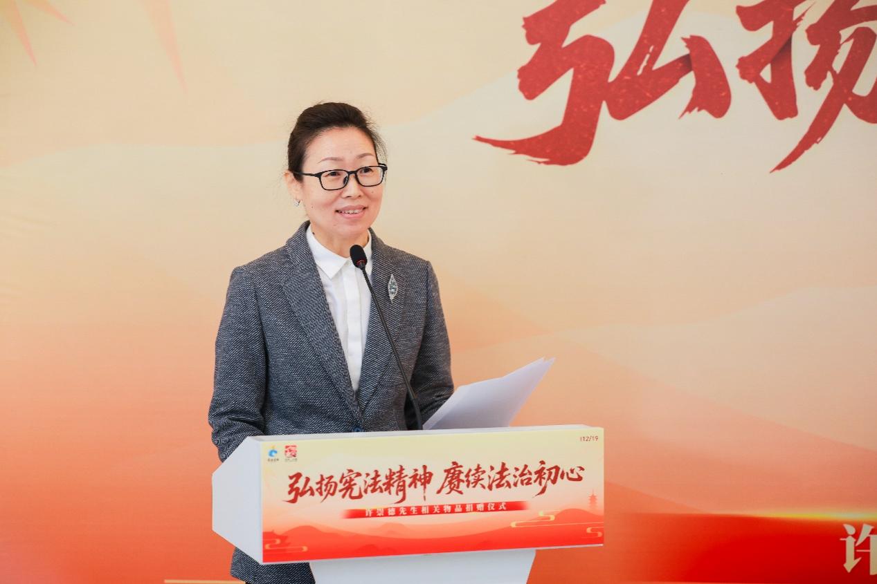 仪式开始前,与会人员参观了依托此次捐赠物品布置的“许崇德生平事迹展”,并观看了纪念视频。沃晓静书记代表中国人民大学法学院致辞。她首先向青浦区委、区政府、区司法局、金泽镇表示感谢,向远道而来的许崇德教授弟子代表表示欢迎。沃晓静书记追忆了许崇德教授在人大法学院求学、任教六十载的历程,回顾了许崇德老师作为新中国宪法学的主要奠基人和开拓者、作为“中国特色社会主义法律体系建设的积极推动者”、作为中国人民大学荣誉一级教授,为我国宪法和法治建设事业以及宪法学和行政法学研究事业做出的巨大贡献。沃晓静书记表示,此次捐赠的物品,承载着许崇德教授的学术生命、生活气息与精神印记,希望其能成为未来开展法治教育最鲜活、最感人的素材;中国人民大学法学院也将继续支持许崇德宪法学理论的研究,持续推动许崇德教授精神的时代传承。