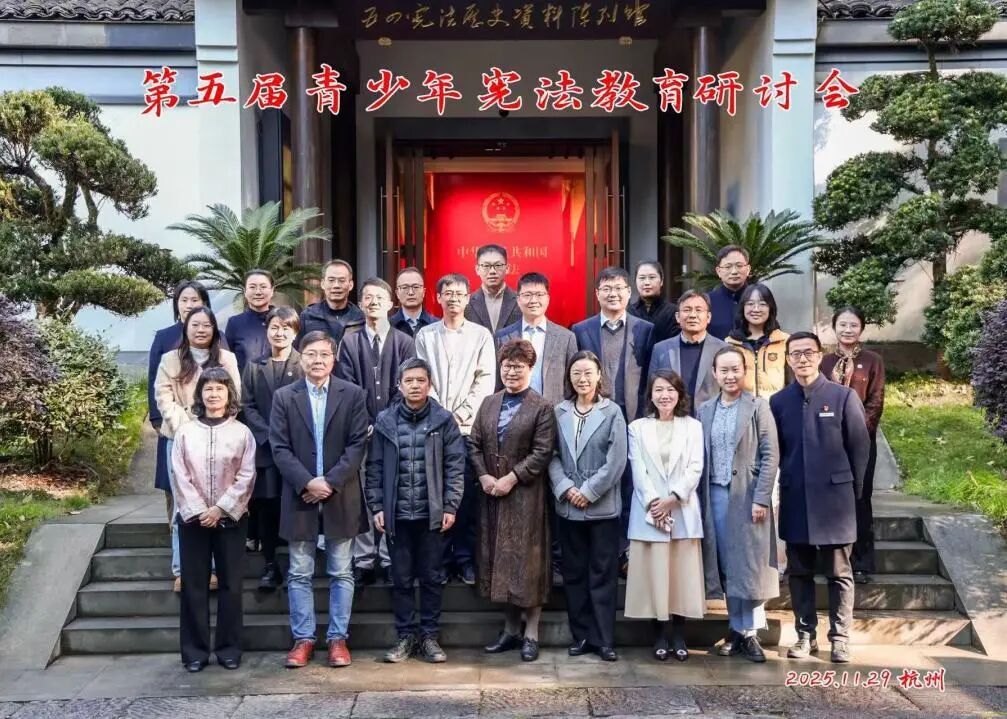 2025年11月29日,第五届青少年宪法教育研讨会在杭州“五四宪法”历史资料陈列馆举行。本次会议由中国人民大学青少年宪法教育研究中心、“五四宪法”历史资料研究会、“五四宪法”历史资料陈列馆共同主办,来自中国人民大学、浙江大学、华东师范大学、同济大学、首都师范大学、南宁师范大学、浙江工业大学的多名专家学者参加,研讨会还专程邀请了来自首都师范大学附属中学、杭州育才大城北中学、杭州育才登云小学等青少年法治教育一线的中小学教师参会,围绕青少年宪法教育专题进行探讨。